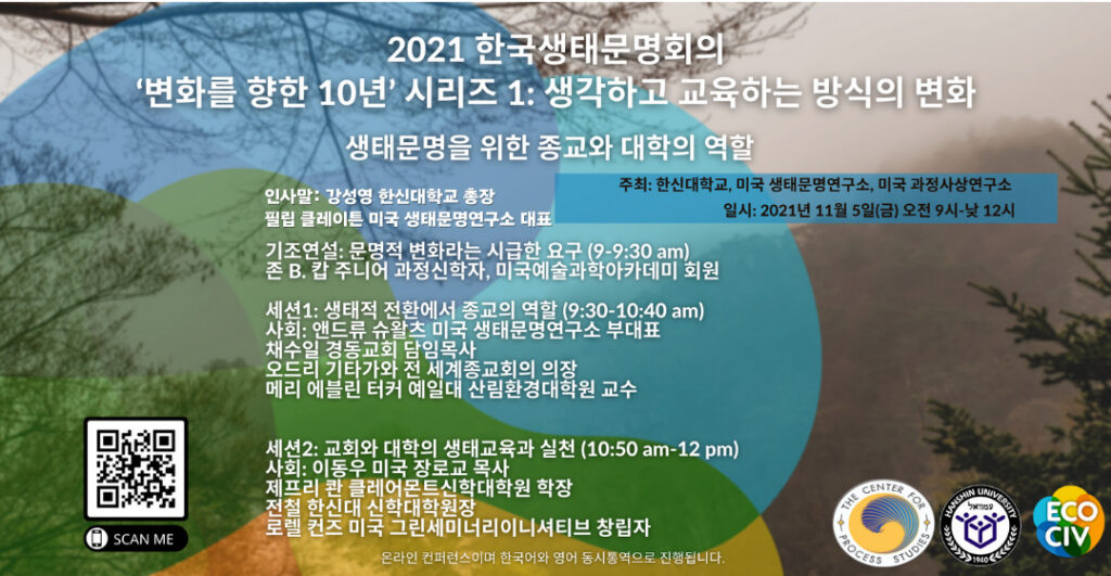 컨퍼런스의 자세한 정보와 등록 방법은 아래에 게시합니다. 이번 컨퍼런스는 Zoom으로 진행되며 한국어와 영어의 동시통역이 제공됩니다. 한국에서 접속하시는 분들은 포스터에 있는 QR 코드로 등록 하실 수 있습니다. 2021년 한국 생태문명 컨퍼런스는 한국시간으로 11월 5일, 오전 9시-12시, 11월 12일, 오전 9시에서 오후 5시까지 진행됩니다. 한신대학교와 서울시 교육청이 함께 준비하는 이 컨퍼런스에 관심과 참여를 부탁드립니다.