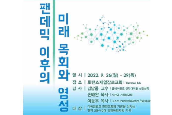 강사는 김남중 교수(클레이몬트 신학대학원 실천신학), 손태환 목사(시카고 기쁨의 교회), 이동우 목사 (저서 ‘포스트 팬데믹 메타교회가 온다’)가 나서 강의한다.