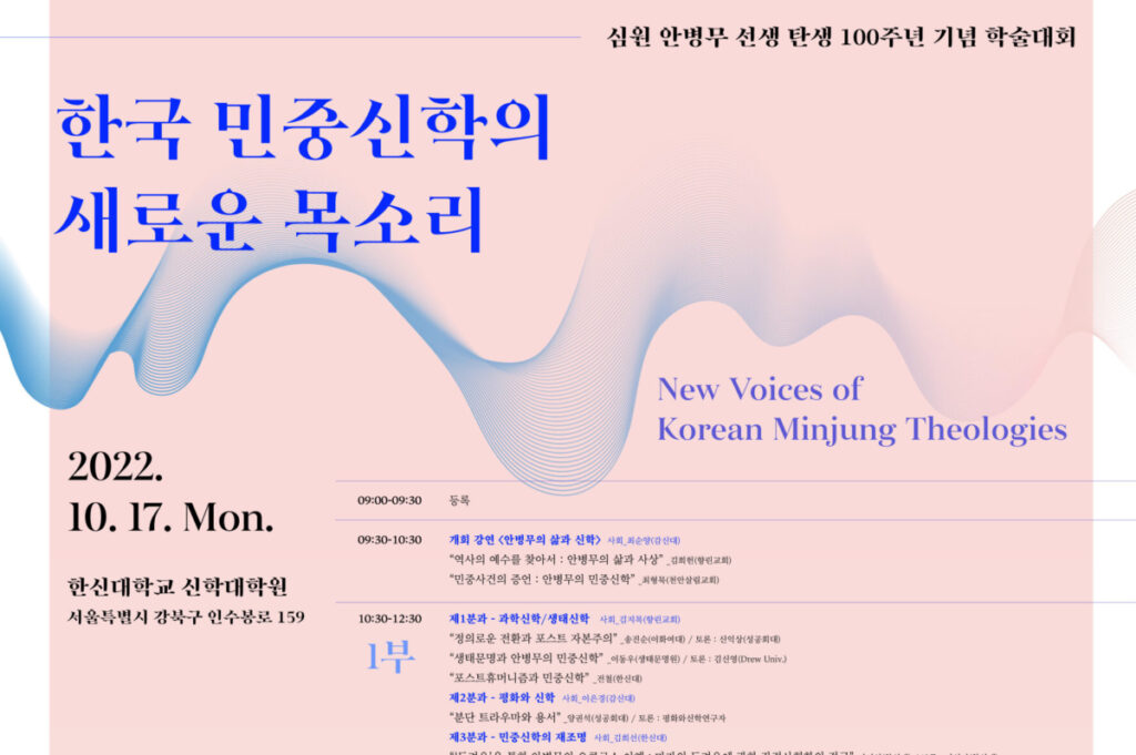 On Monday, October 17, 2022, the 100th anniversary commemorative conference of Minjung theologian Byeong-mu Ahn will be held at the Hanshin University Graduate School of Theology. On behalf of Ecological Civilization, in the first part ‘Science Theology and Ecological Theology’, I am going to give a presentation under the title of “Ecological Civilization and Ahn Byung-Mu’s Minjung Theology”. This academic conference is specially designed to discover new voices of Korean Minjung theologies in 2022.
